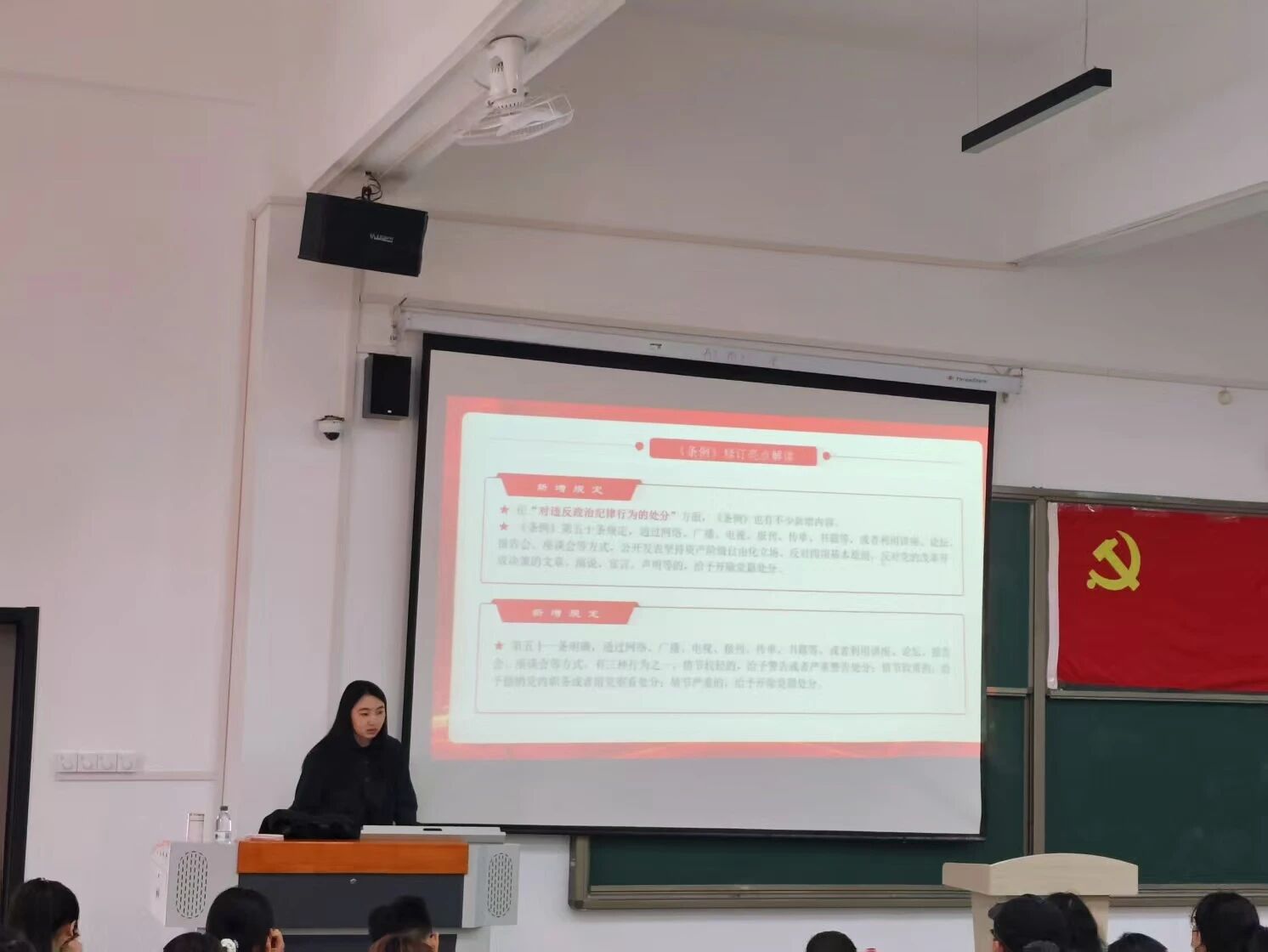 为持续深化全面从严治党要求,强化入党积极分子的纪律意识与党性修养,引导青年学子树立正确的党员标准,2026年4月3日,数字经济与管理学院第24期党课培训班开展《中国共产党纪律处分条例》专题学习。马克思主义学院杨静老师以“明‘纪’于心 守‘纪’于行——做知敬畏、存戒惧、守底线的新时代青年党员”为主题,为全体学员作系统授课,推动党纪党规入脑入心、落地落实。