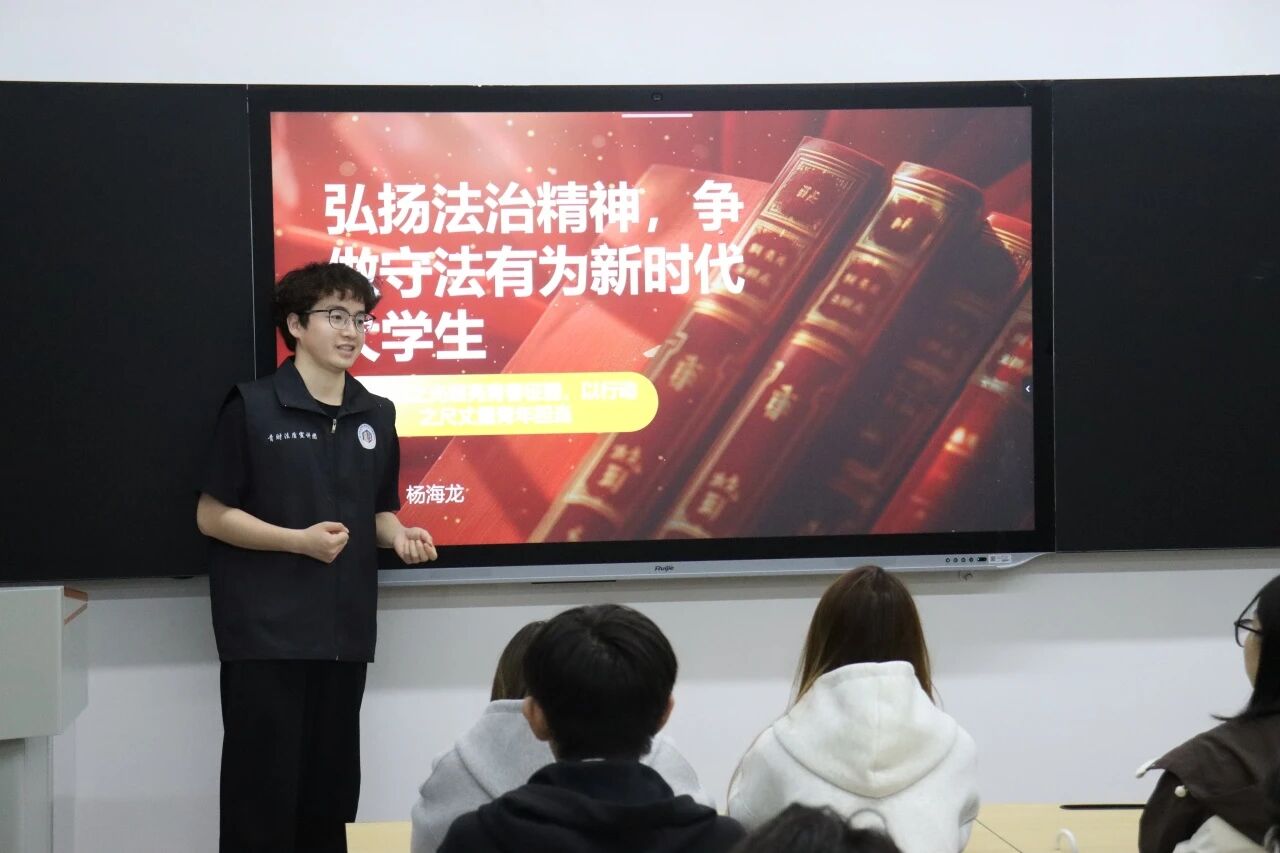 在法治专题讲座中,宣讲团成员杨海龙结合当下社会热点、校园典型案例,围绕《宪法》《民法典》《未成年人保护法》《网络安全法》等与大学生息息相关的法律法规,深入讲解法律条文内涵、违法犯罪危害、维权途径等内容,用通俗易懂的语言剖析校园欺凌、网络诈骗、学术不端、交通违法等常见问题,引导同学们认清法律边界,守住行为底线,学会用法律武器保护自身合法权益。