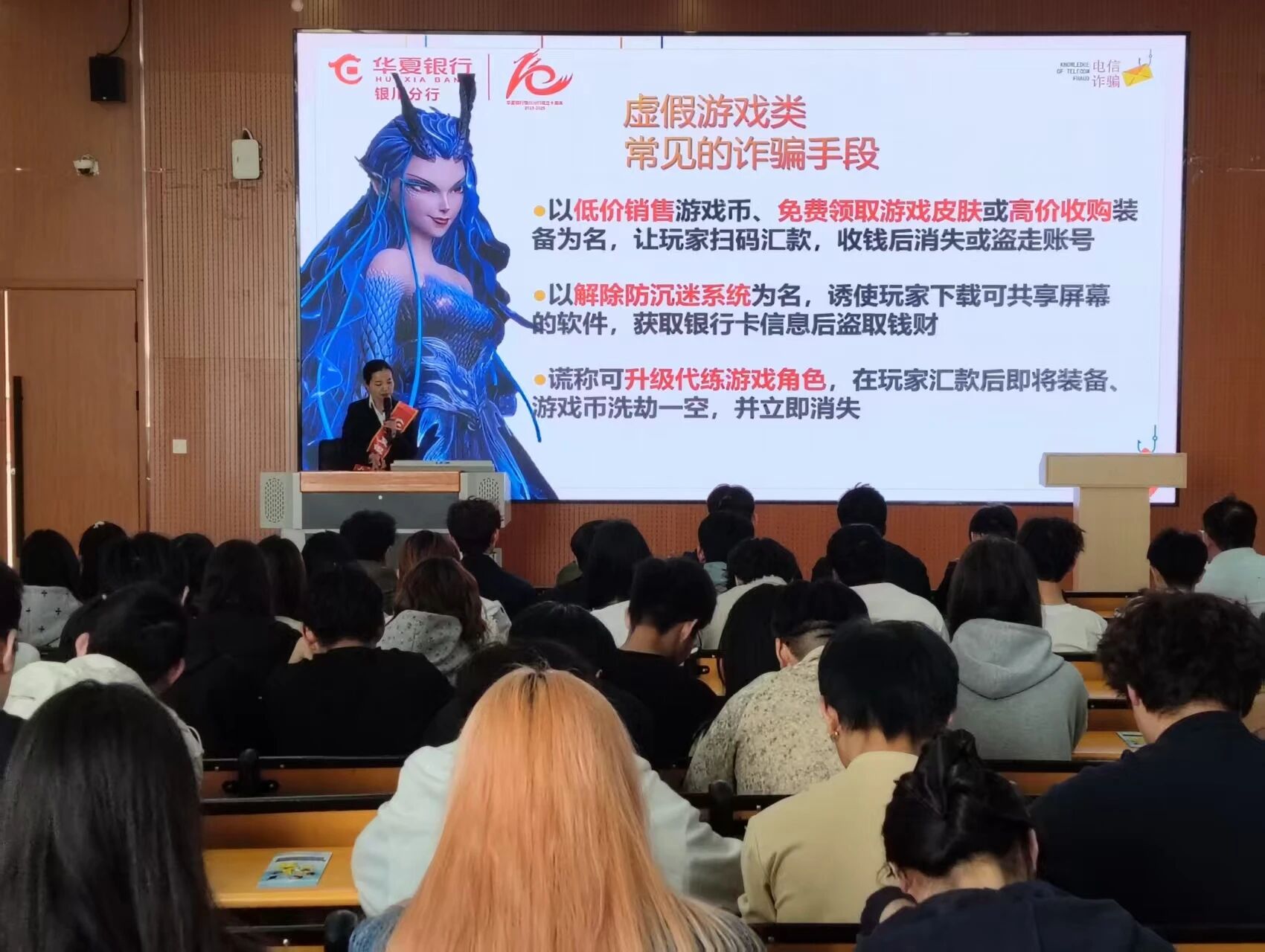 讲座现场,反诈宣讲员结合当下高校诈骗高发案例,针对大学生 防范意识薄弱的特点,通过真实案例剖析、 情景互动等方式,深入拆解了多款校园高频诈骗手段,重点分析了大学生容易受骗的心理误区,提醒同学们切勿贪图小利、轻信陌生信息 。